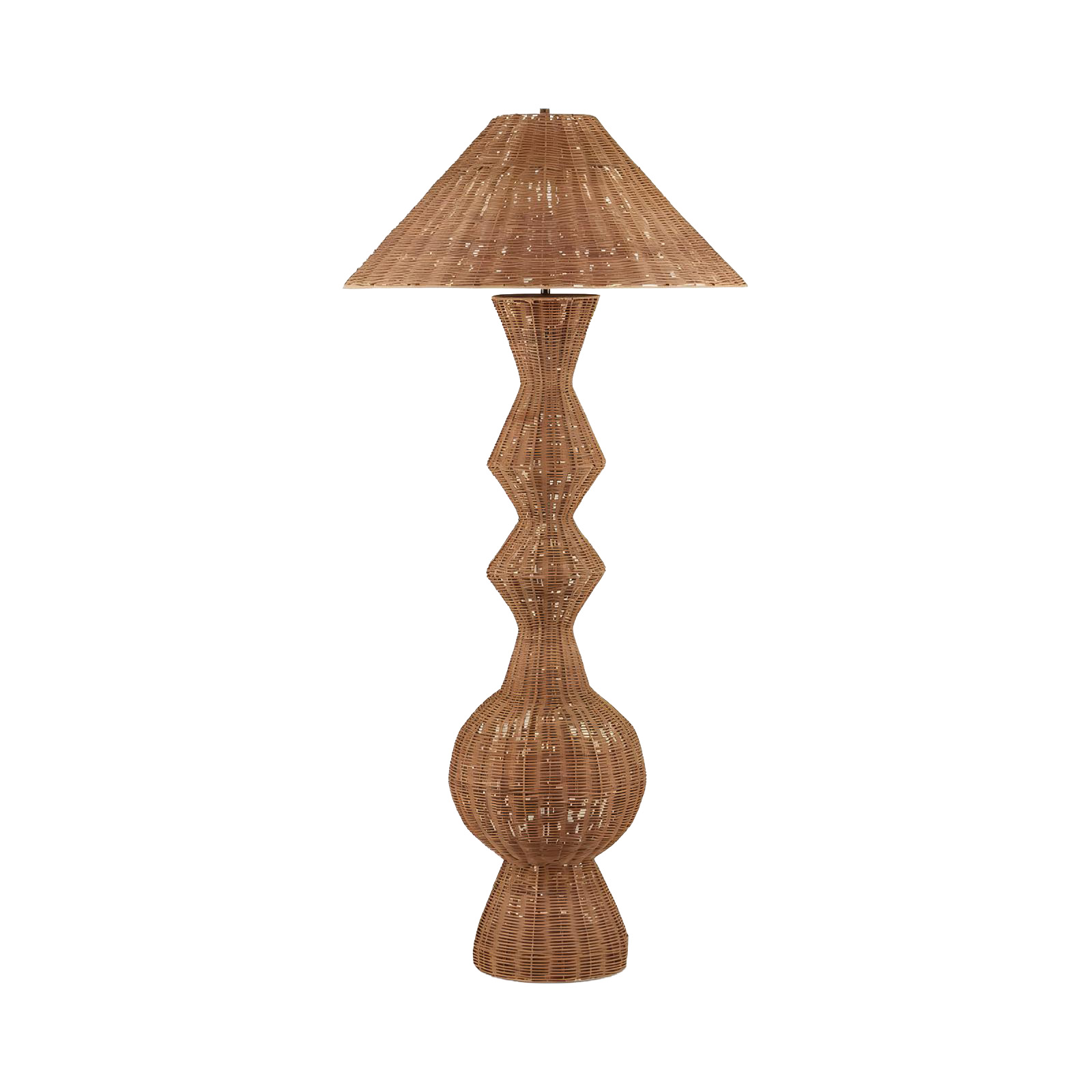 Peça maravilhosa para qualquer decoração: abajur de chão todo em rattan, com cúpula e haste trabalhada