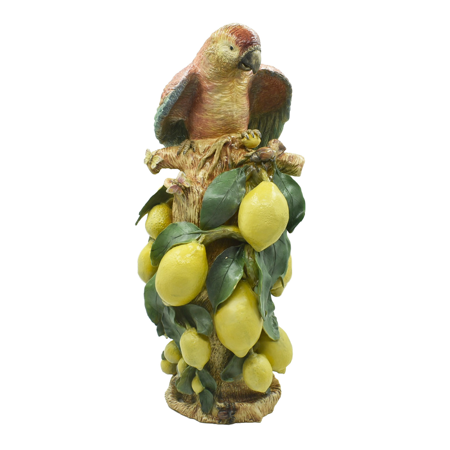 Enfeite imponente de arara no tronco com limões sicilianos