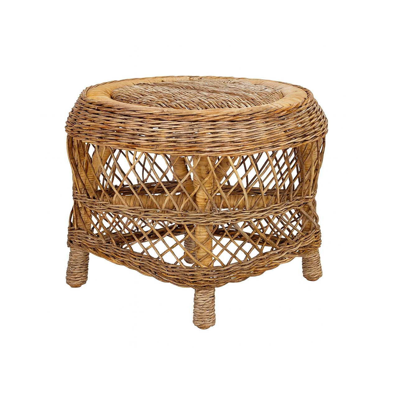 Charmoso banco ou mesa lateral redonda, toda trançada em rattan