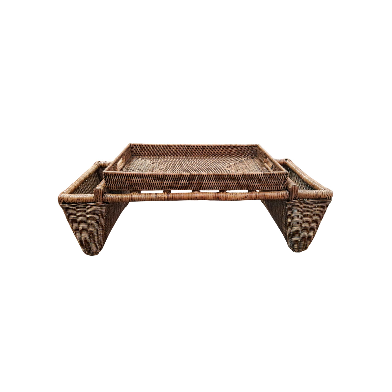 Linda e prática, bandeja de rattan com pé e dois porta jornais nas laterais. A bandeja é removível, podendo ser usada sozinha