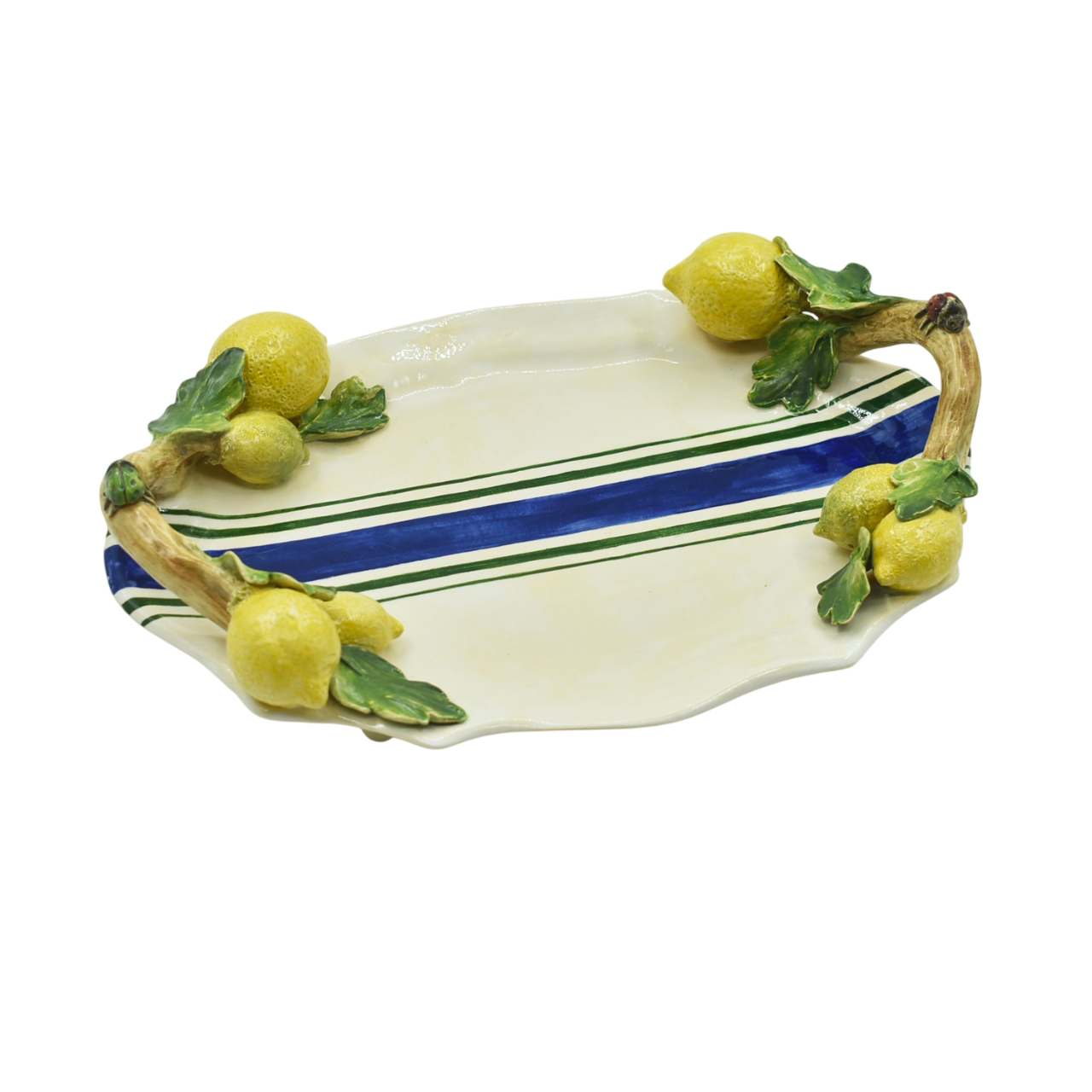 Linda bandeja/travessa para servir e decorar: modelo Maria, com borda trabalhada, listras azuis no centro e apliques de limões sicilianos e alça de galho