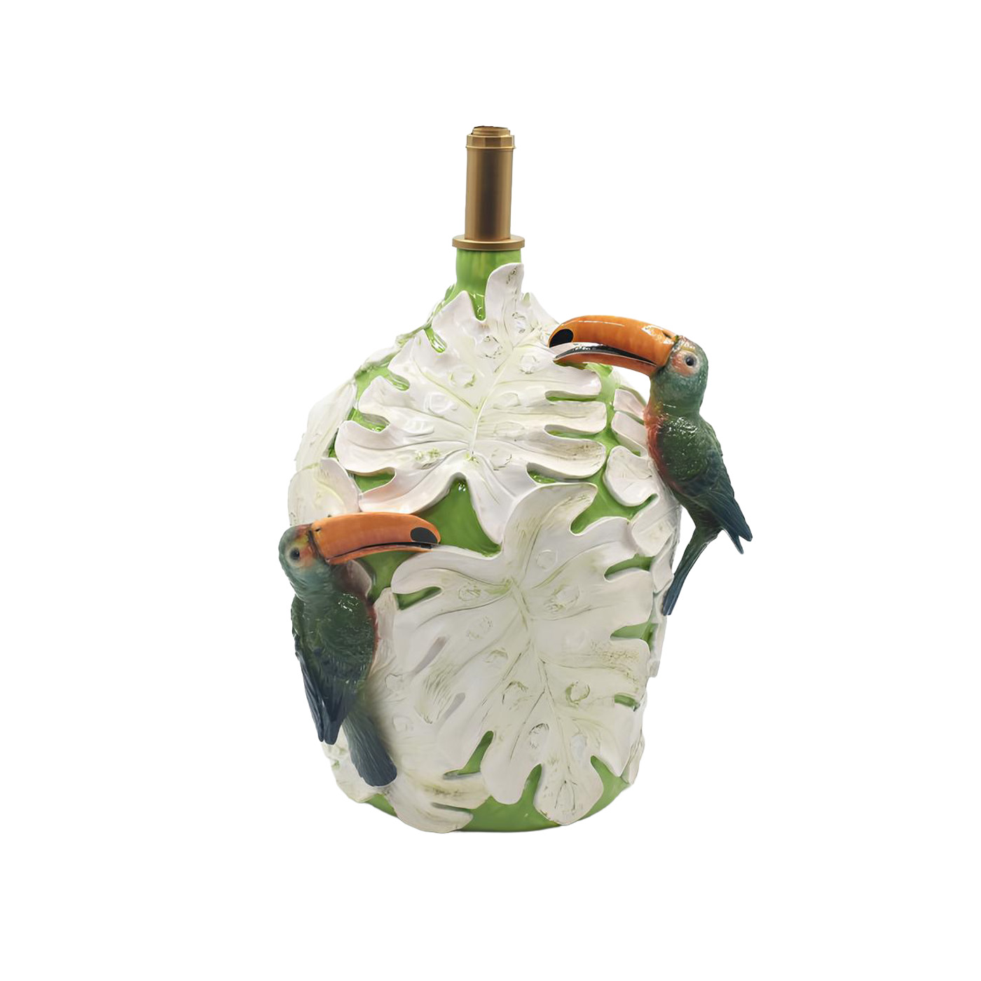 Linda base de abajur modelo garrafão bem tropical, com fundo verde e aplique de folhas de costela de Adão brancas e casal de tucanos