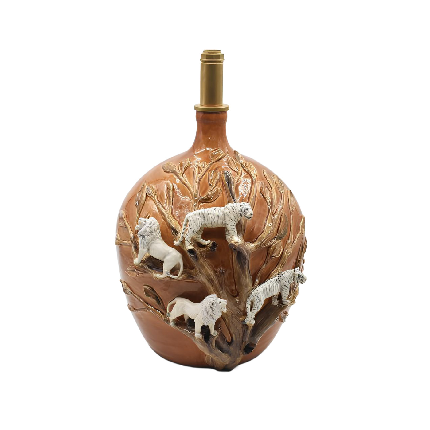 Base de abajur modelo garrafão no estilo savana, na cor terracota e aplicação de tigres, leões e folhas