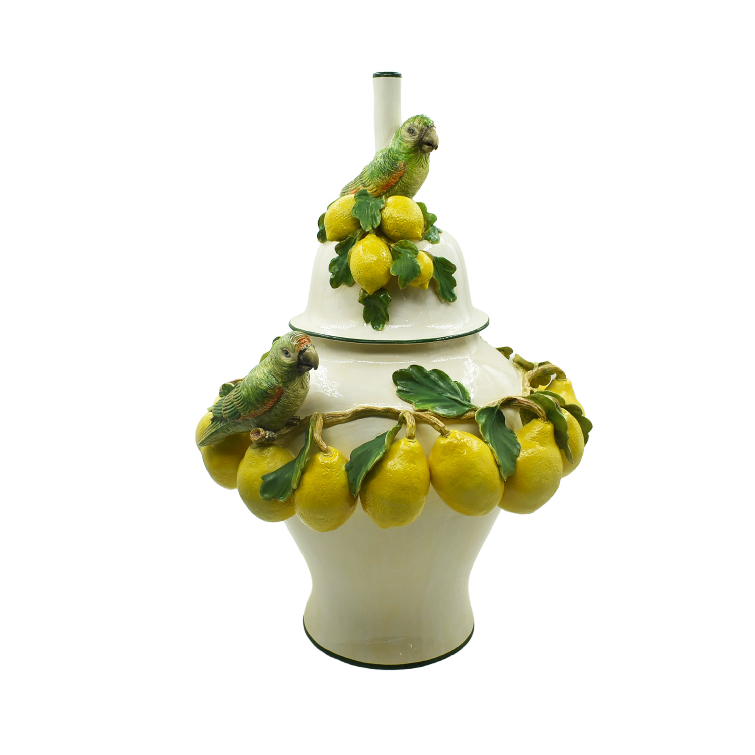 Linda base de abajur em formato de potiche com limões sicilianos e pássaros aplicados