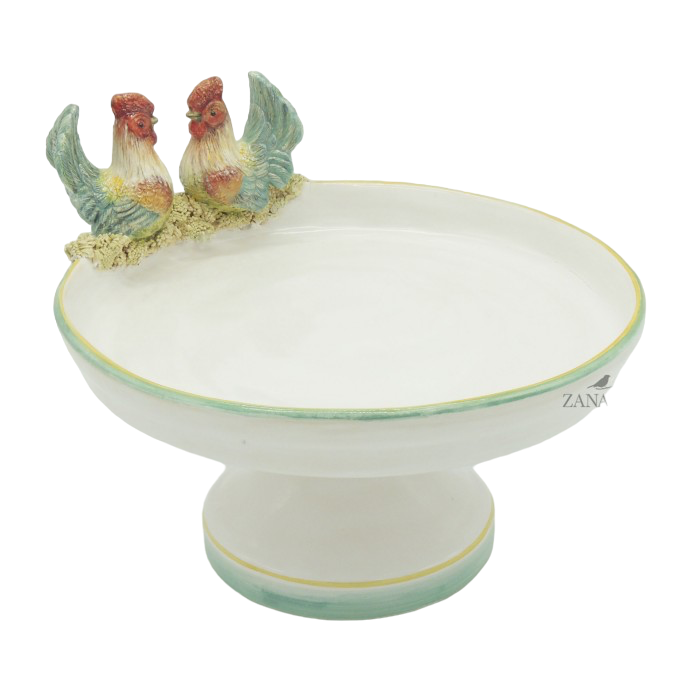 Linda boleira com aplicação de 2 galinhos feitos e pintados à mão pela Zanatta Casa