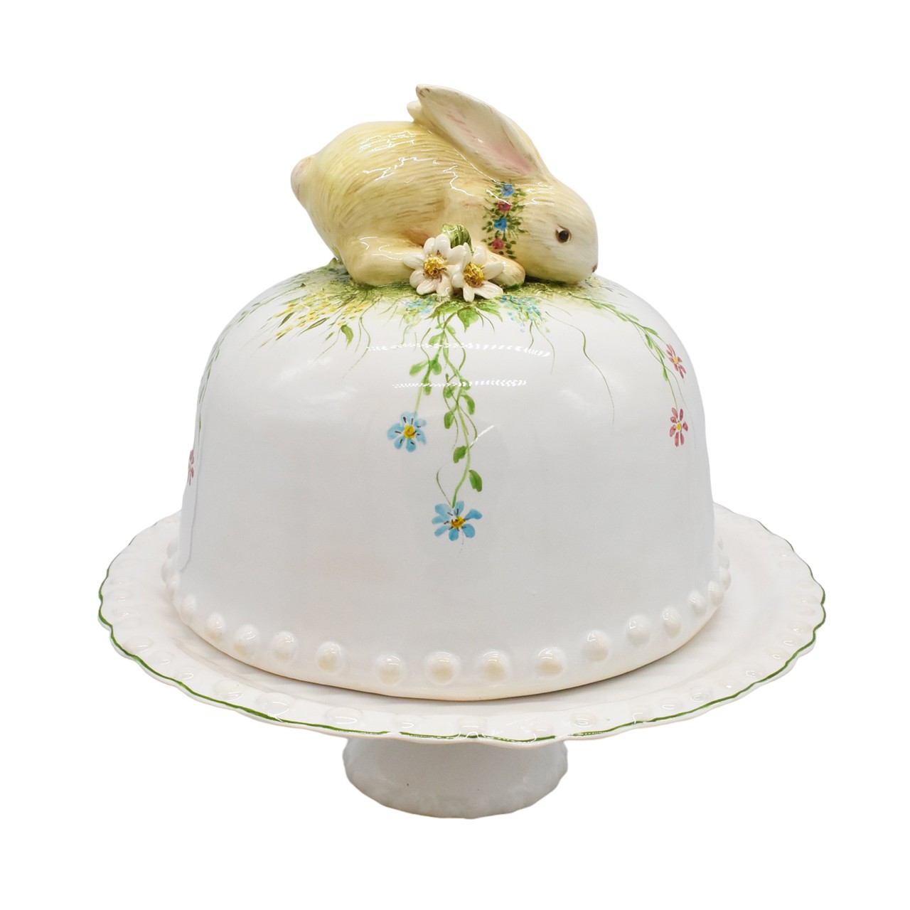 Para dar mais charme em qualquer mesa: boleira com pé com desenho de flores e aplicação de coelho! Uma graça!