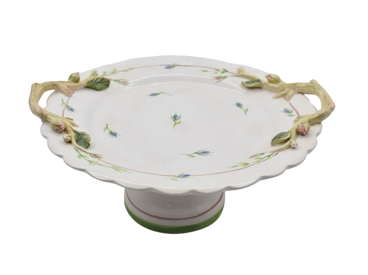 Linda e delicada boleira com pintura de rosas azuis e pegadores em formato de tronco