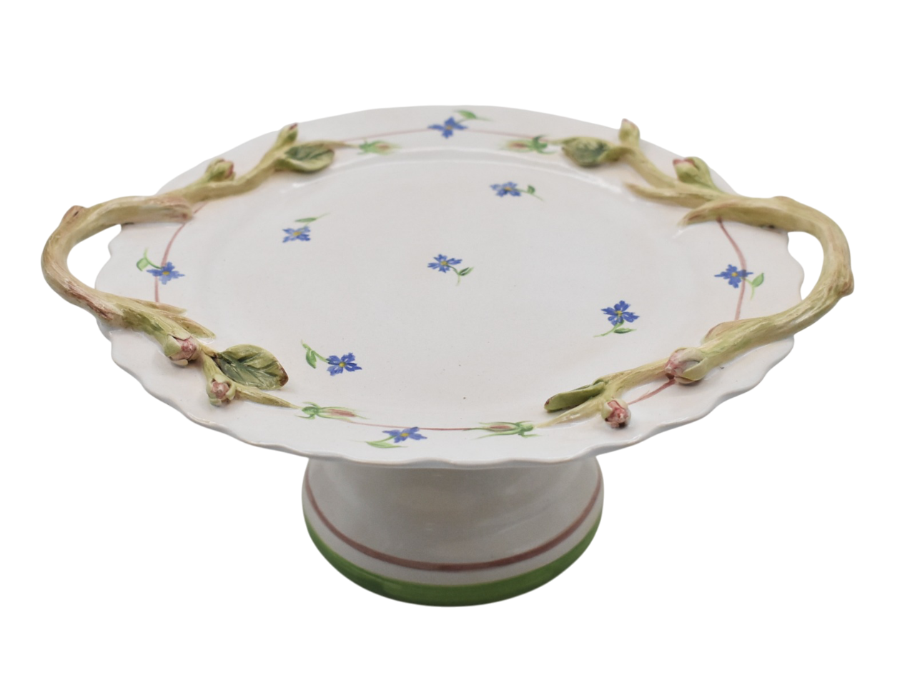 Linda e delicada boleira com pintura de rosas azuis e pegadores em formato de tronco