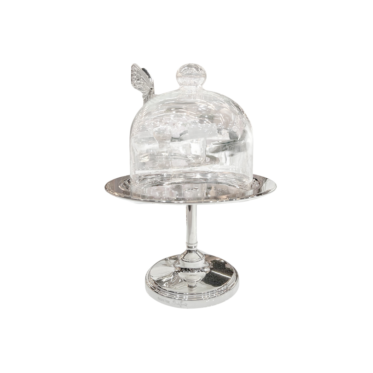 Lindíssima boleira toda em prata, com redoma de vidro e lindo detalhe de borboleta em prata. Uma peça de efeito!