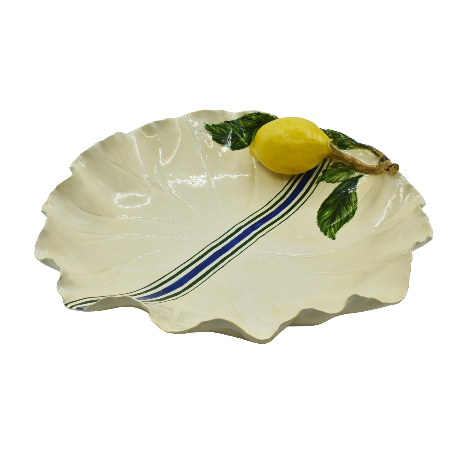 Lindo bowl modelo Vitória Régia com listras azuis no centro e aplique de limão siciliano
