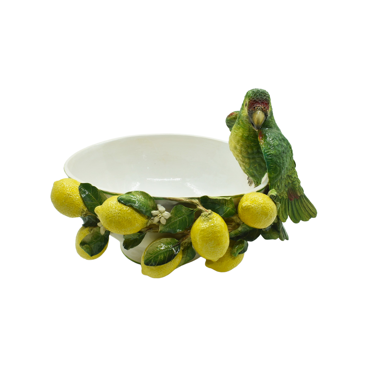 Lindo cachepot com aplique de limões sicilianos e papagaio, uma peça especial
