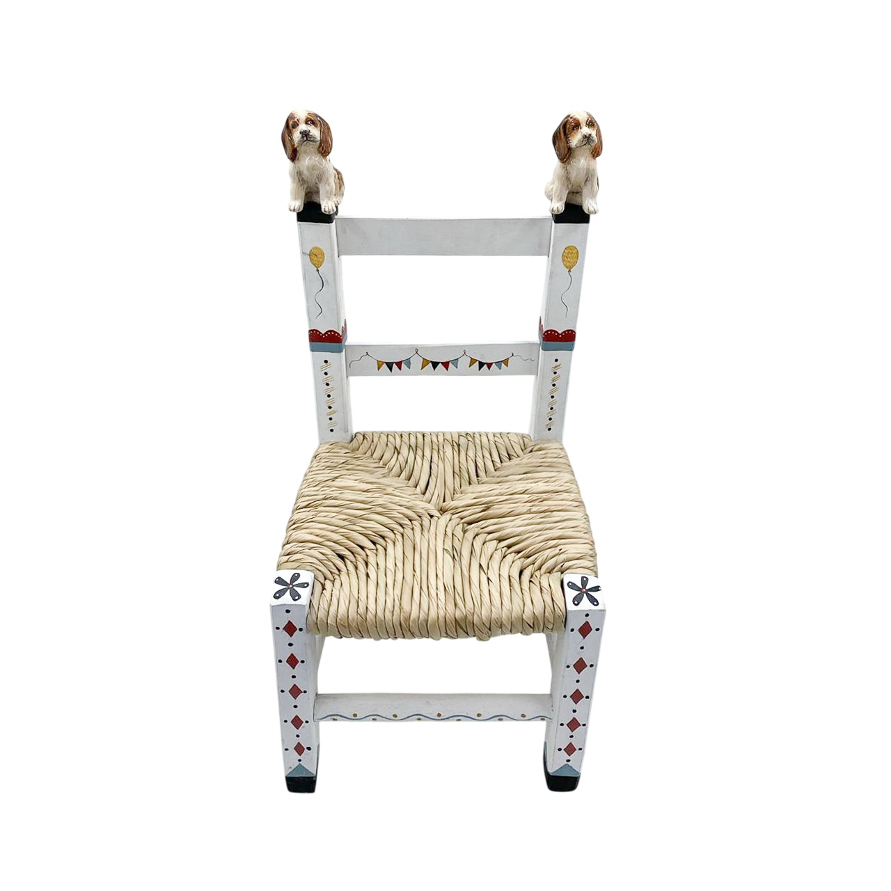 Tem mais charmosa? Cadeira infantil de madeira, com pintura colorida, assento de taboa e dois cachorrinhos lindos de cerâmica no encosto!