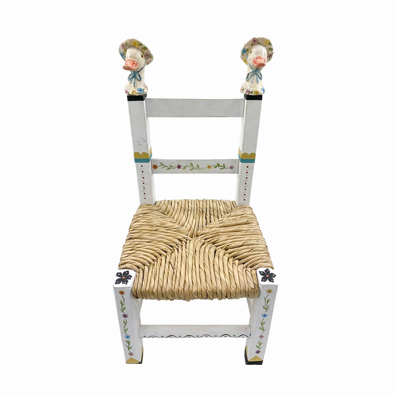 Cadeira infantil de madeira pintada, assento de taboa e pato