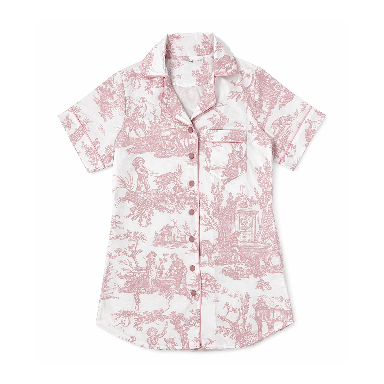 Charmosa camisola de manga curta com estampa de toile de jouy rosa, um mimo!