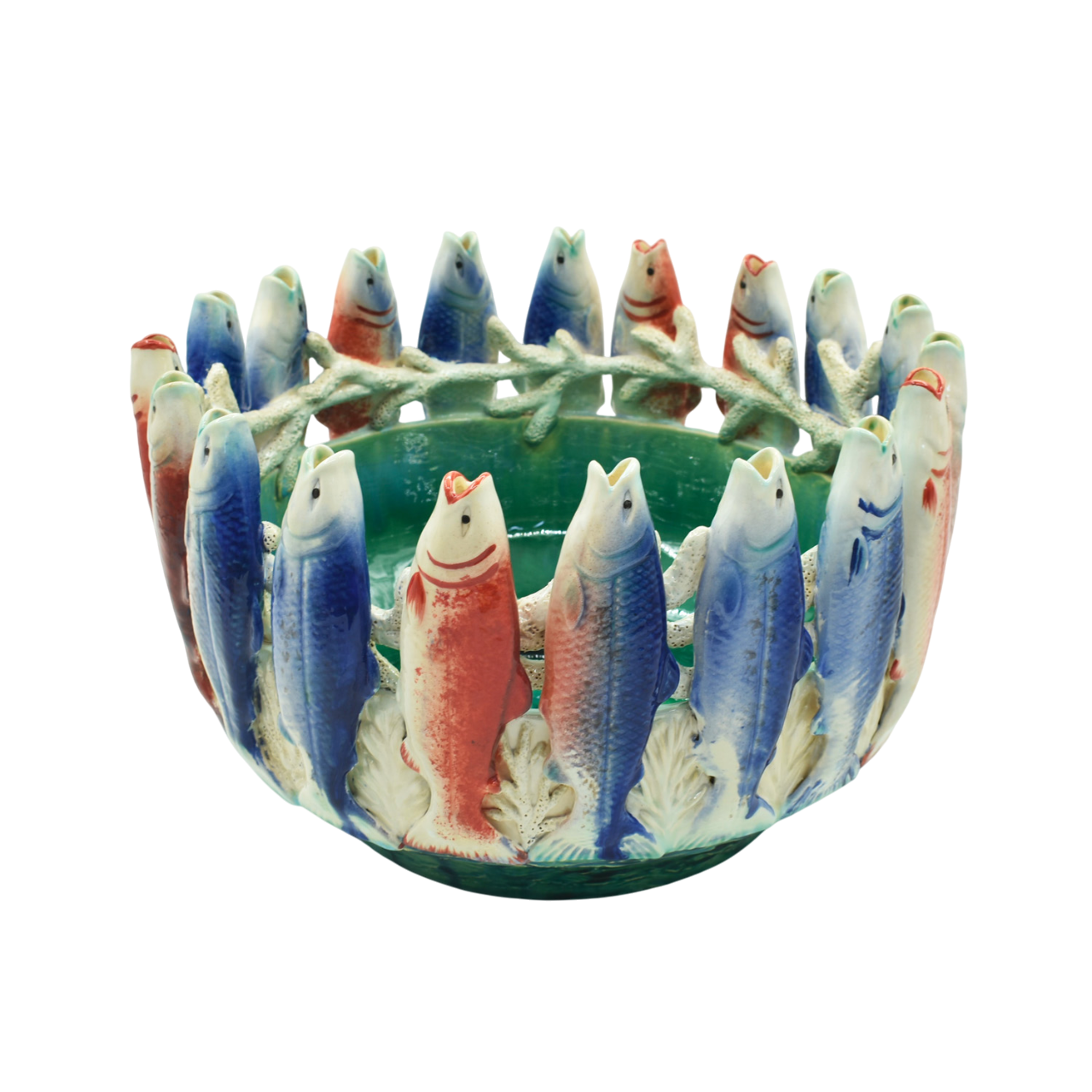 Lindo centro de mesa com aplique de peixes coloridos em toda a volta e corais