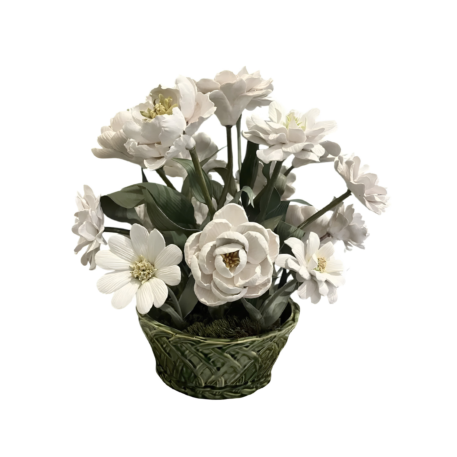 Linda cesta verde feita em cerâmica com folhas em metal e flores em porcelana, trazendo maior durabilidade e delicadeza para a peça