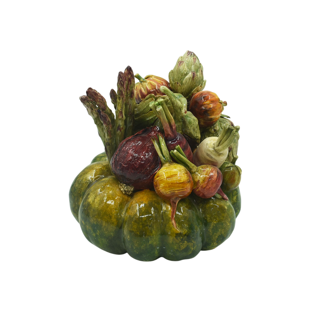Lindo enfeite em formato de abóbora na cor verde e vários legumes, uma peça especial