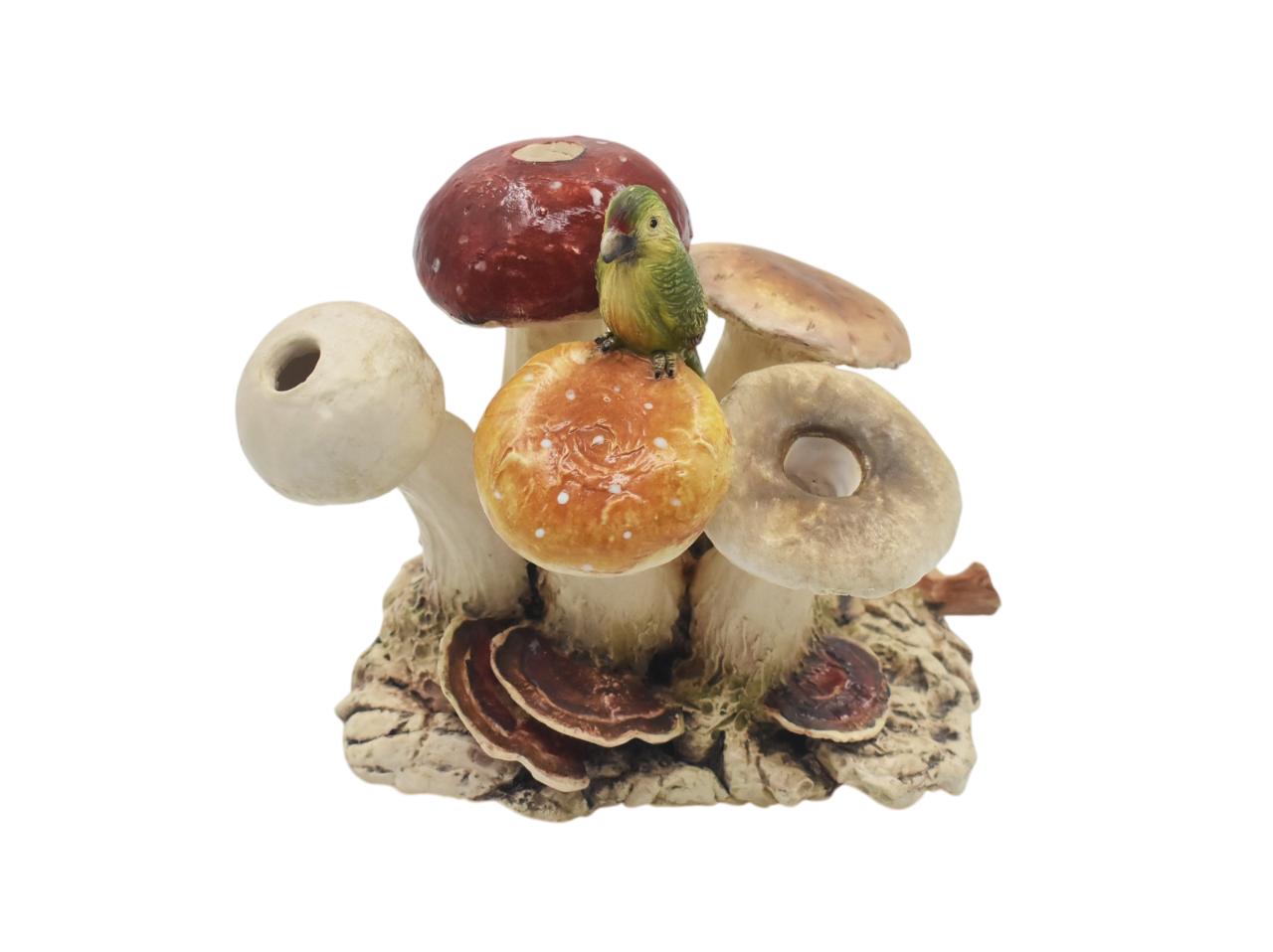 Uma graça para decorar a mesa, cozinha...conjunto de cogumelos coloridos com passarinho verde. Dá para colocar flores em alguns cogumelos.