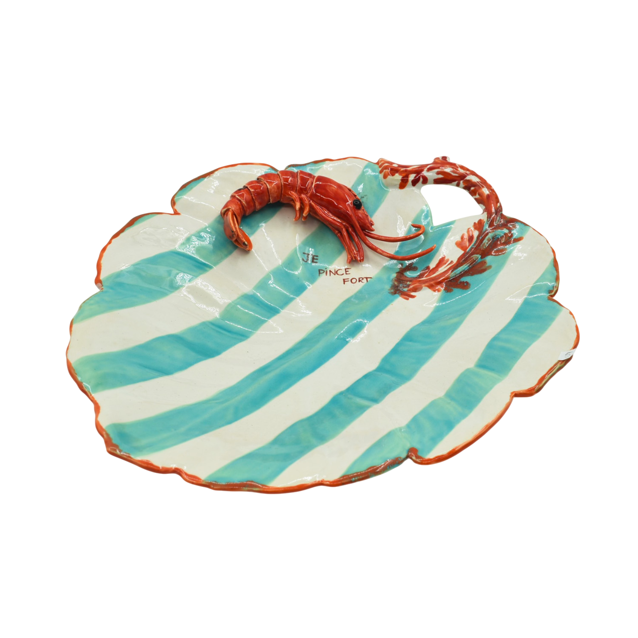 Folha decorativa com listras turquesas e aplique de camarão, para servir ou decorar