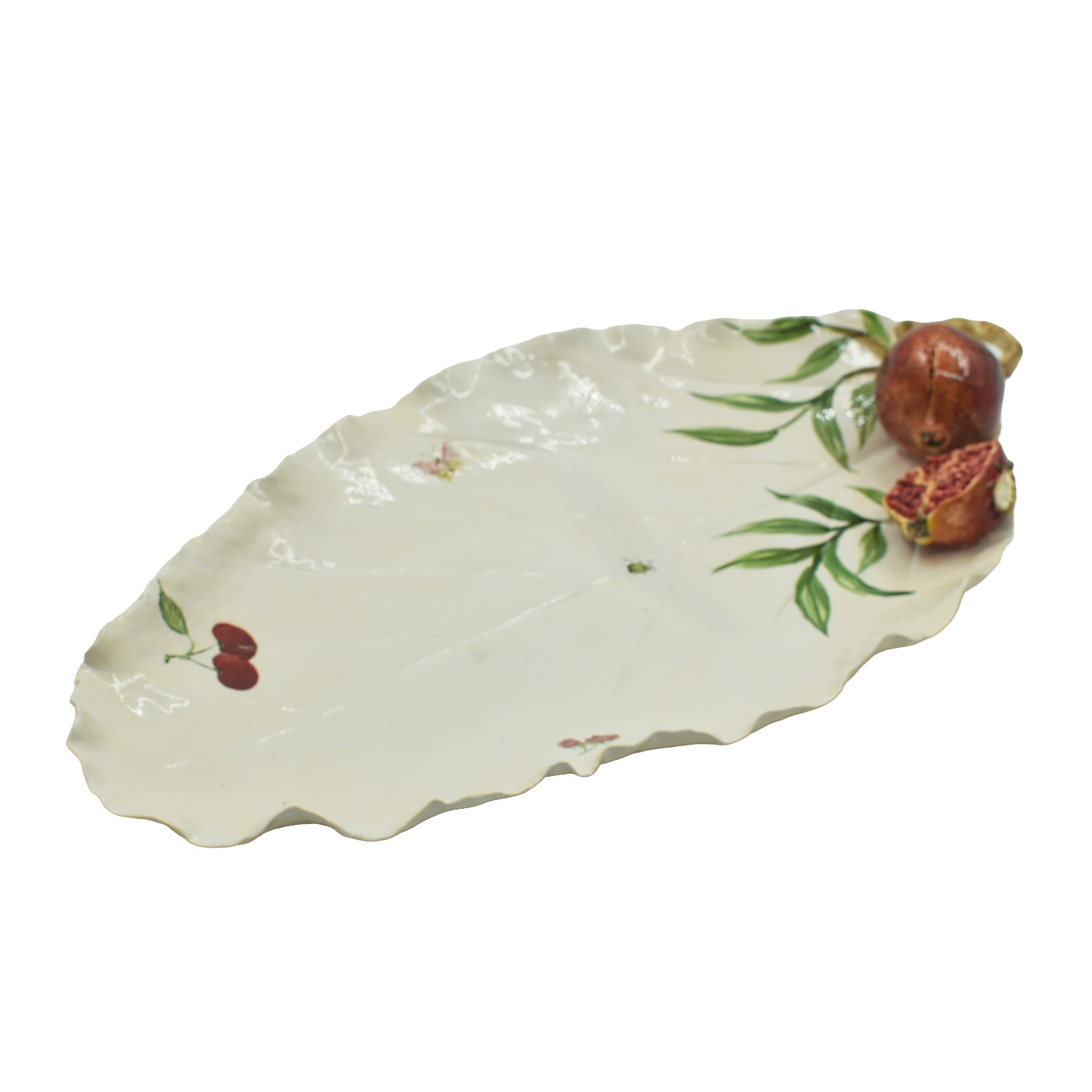 Linda folha, grande, para usar como travessa ou decorativa, com aplique de romãs