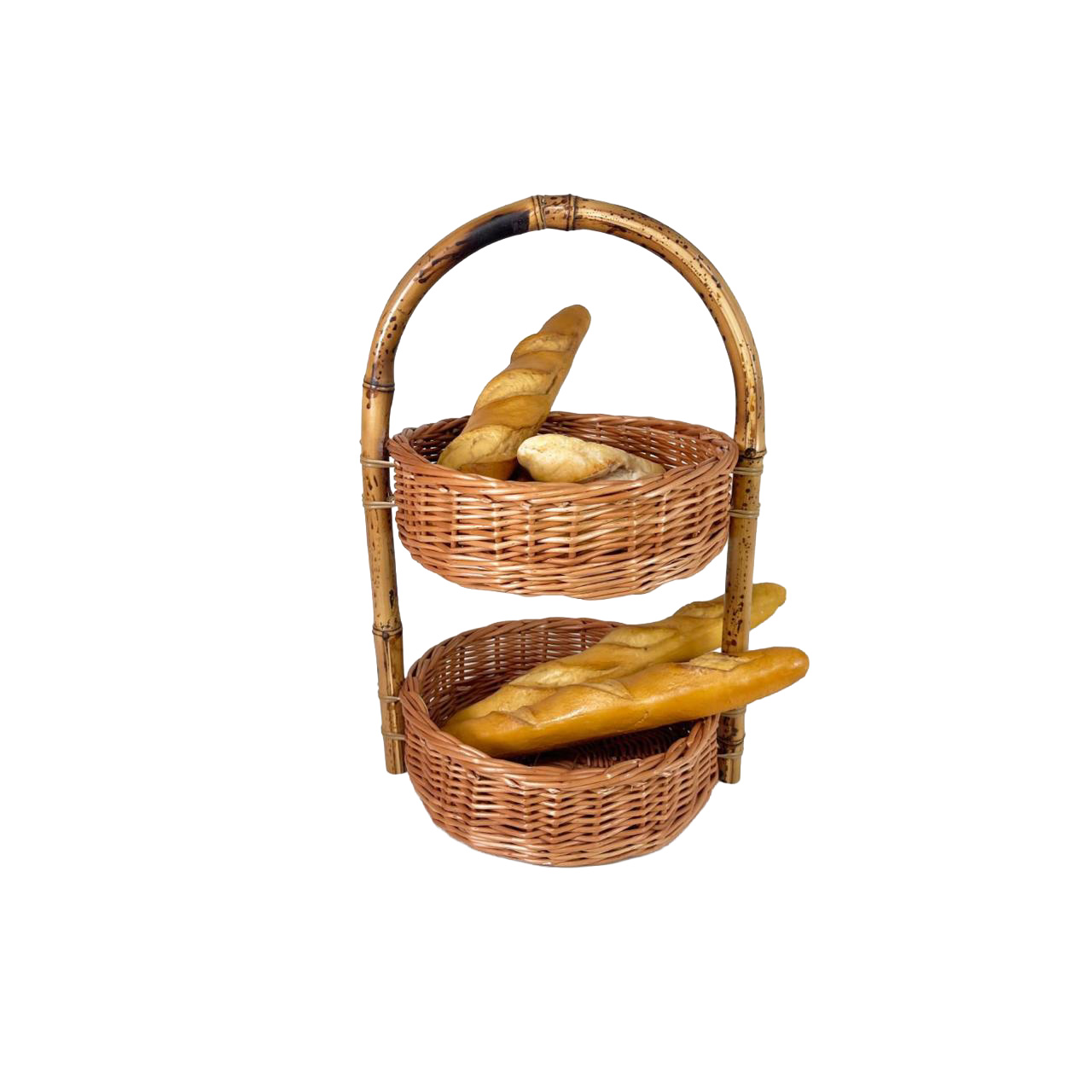 Para organizar a cozinha com charme: fruteira redonda em vime com dois andares e alça de bambu