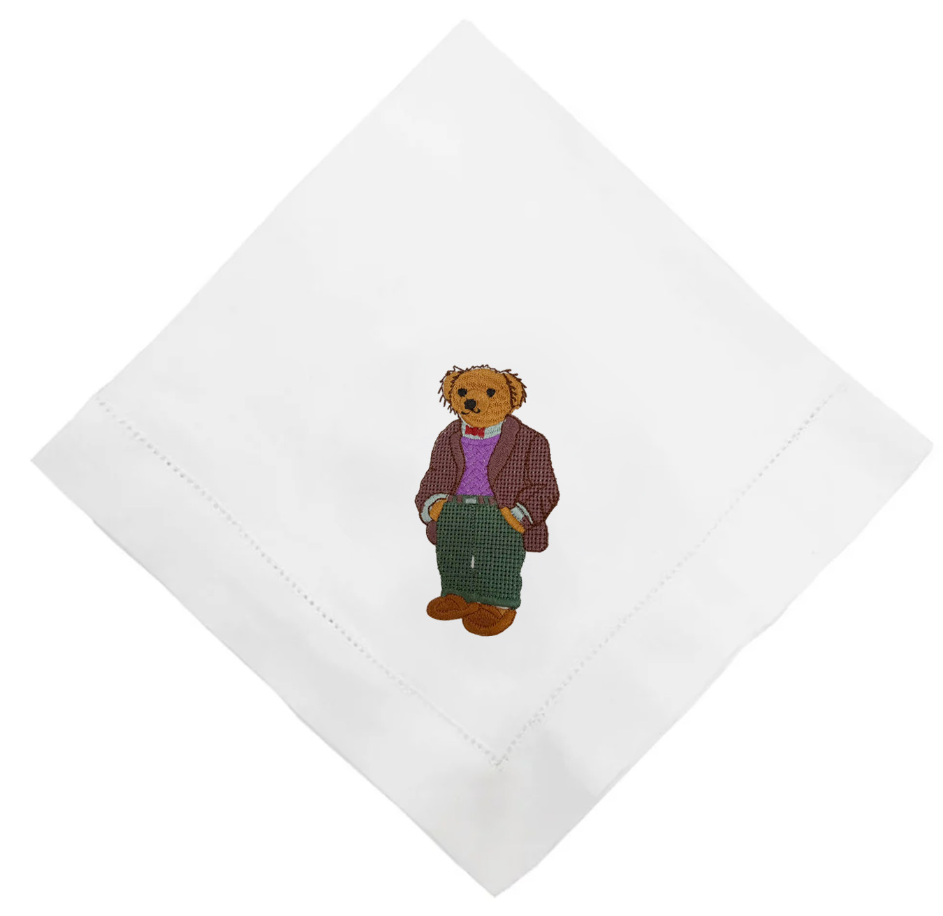 Uma graça para a mesa: guardanapo com bordado de ursinho usando blazer e calça xadrez