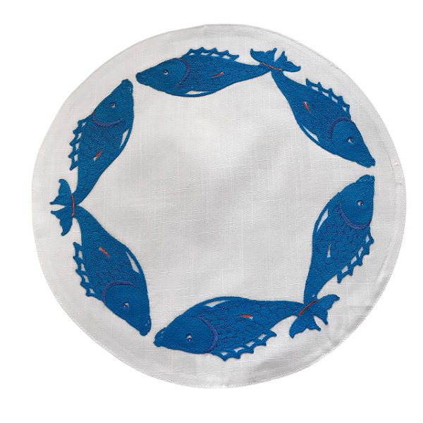 Lindo e delicado jogo americano redondo com bordado de peixes em azul