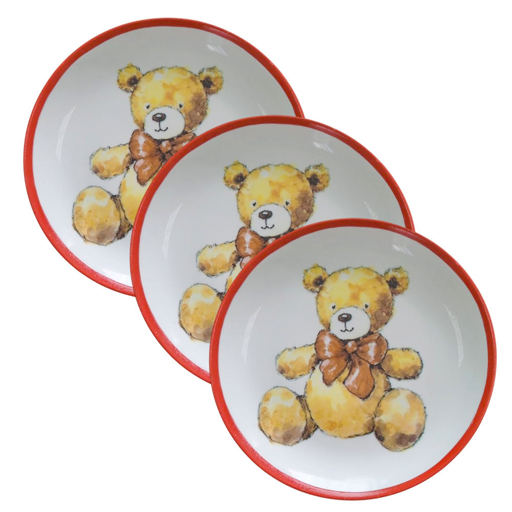 Fofura para as crianças: kit com 3 pratos de sobremesa com desenho de ursinho e friso vermelho