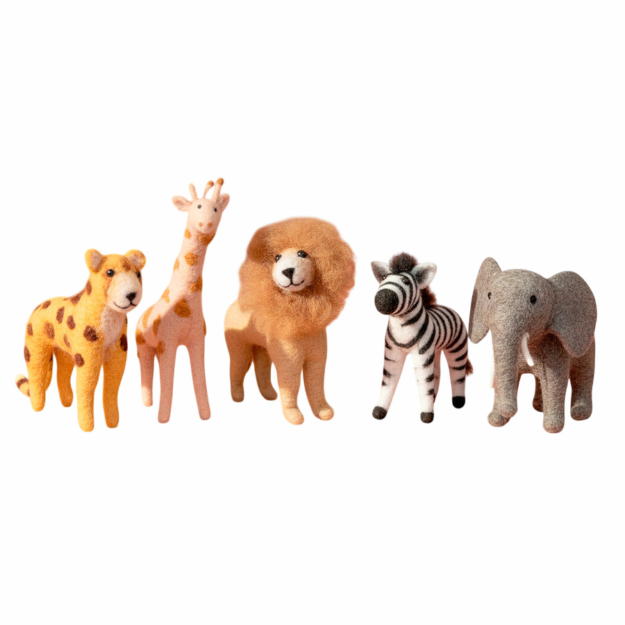 Uma graça para as crianças brincarem: kit com 5 animais da selva feitos em lã de feltro.