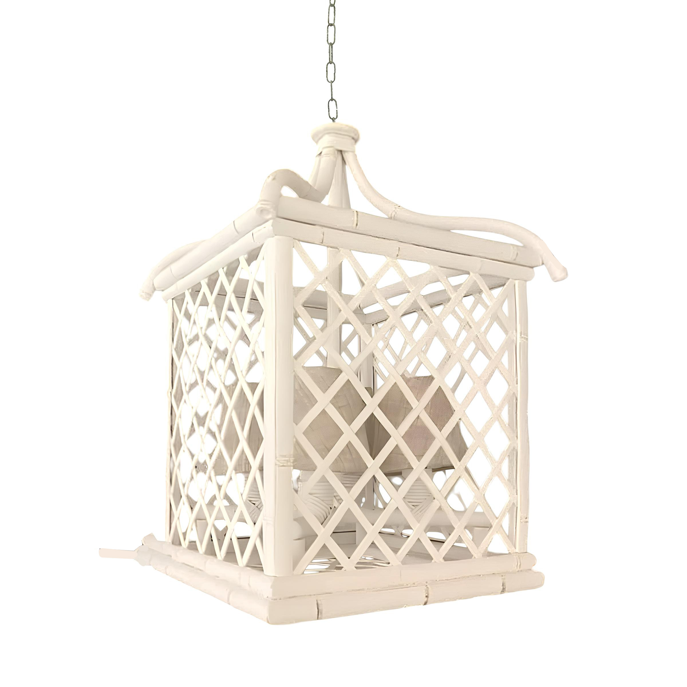 O quadriculado das treliças agora no lustre tipo gaiola, em formato quadrado, um charme