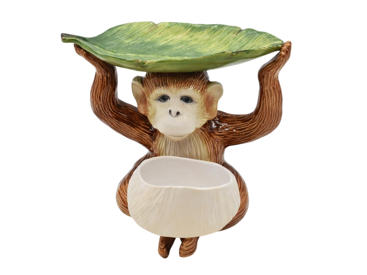 Charmoso enfeite de macaco com bowl no colo e folha na cabeça
