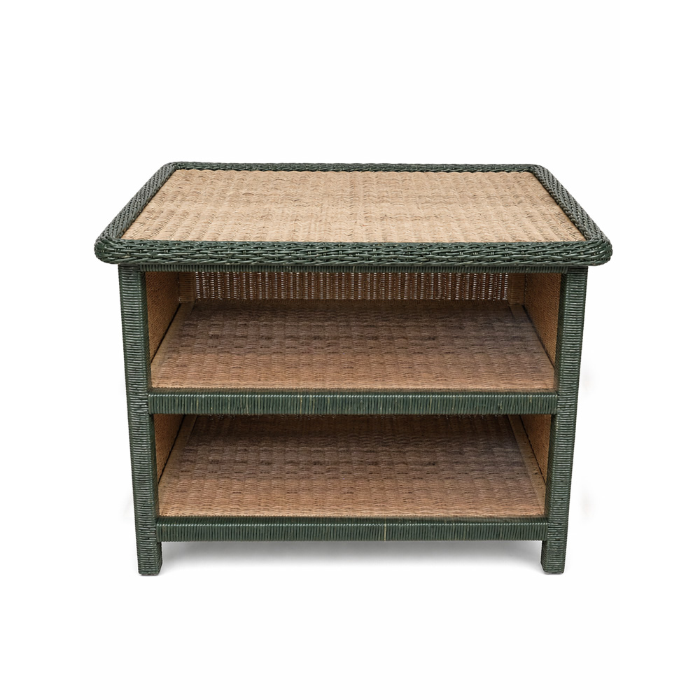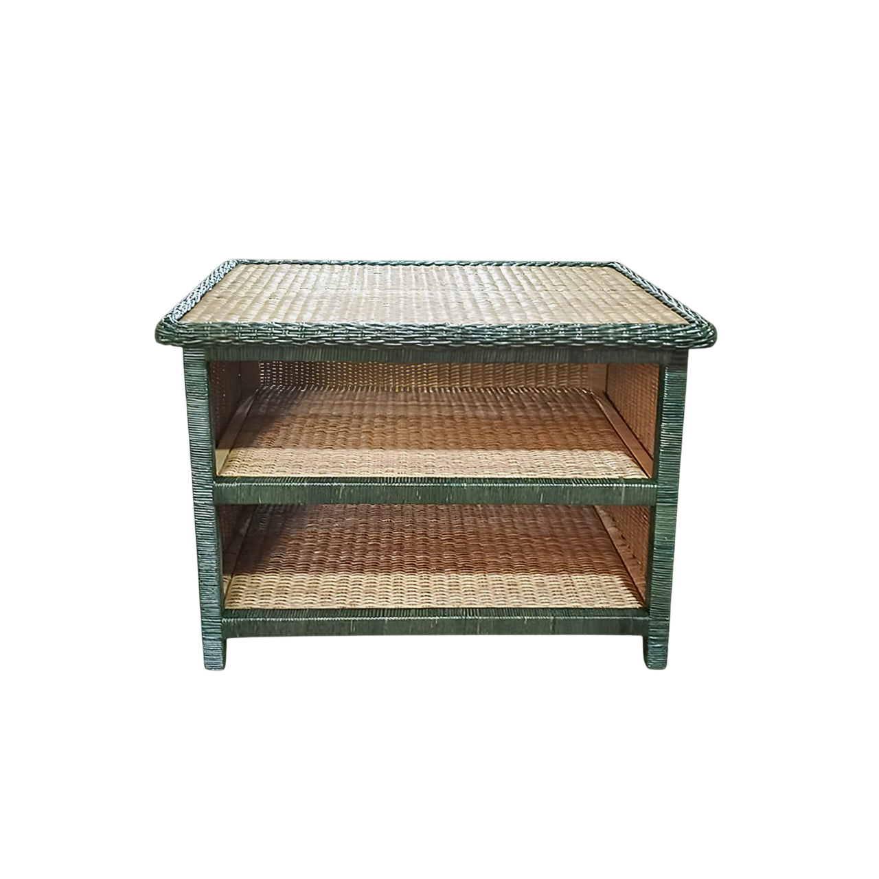 Mesa lateral ou de cabeceira toda em junco, com detalhes trançados e em verde escuro, com dois andares, um charme para qualquer decoração