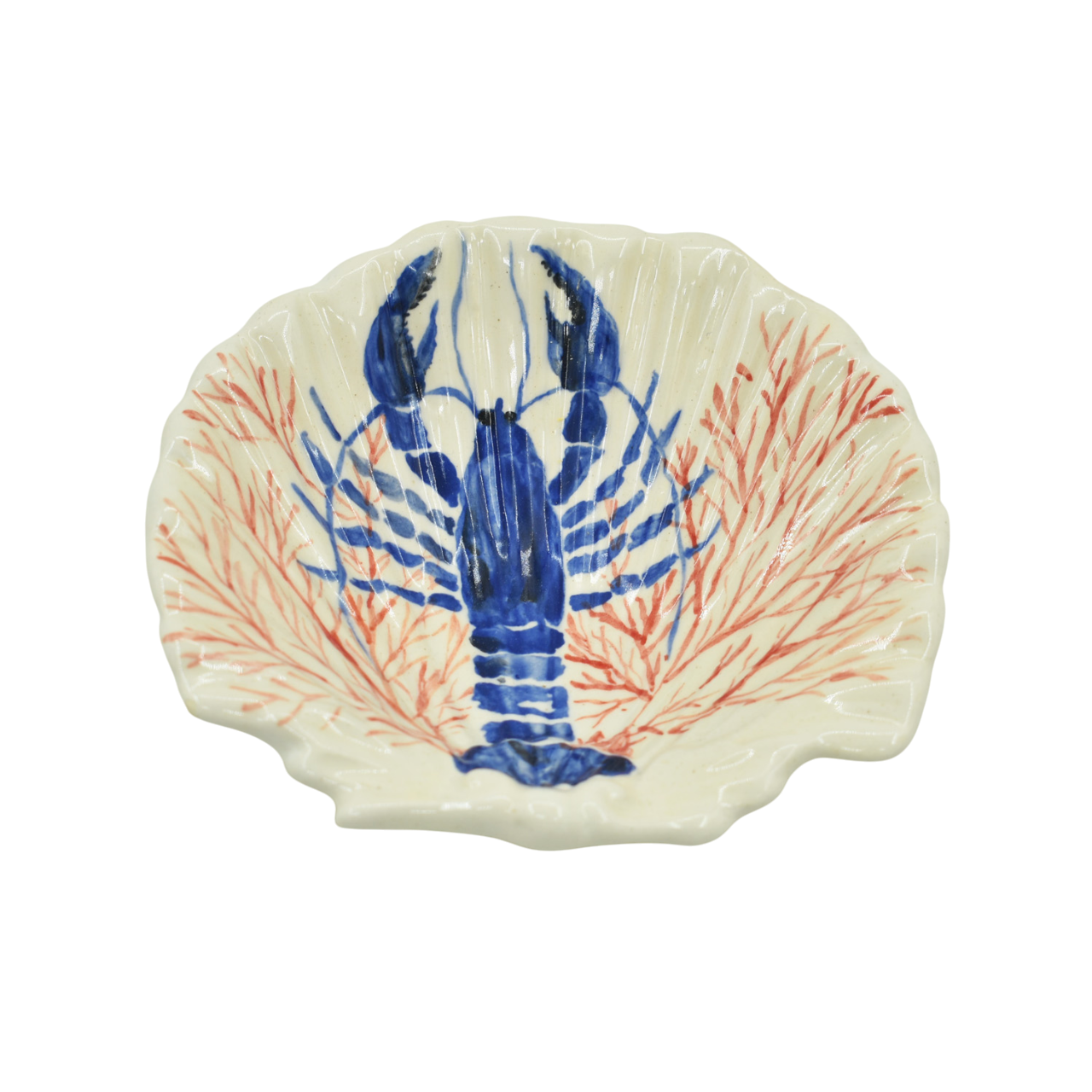 Charmosa mini petiqueira em formato de concha com pintura de lagosta e coral