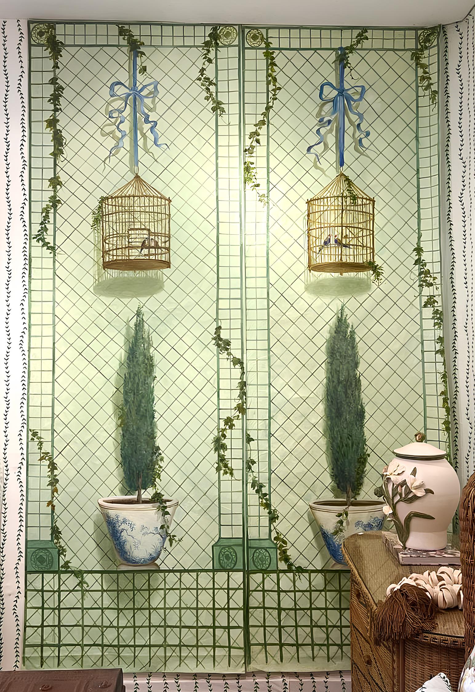 Painel delicado com pintura de topiaria, gaiola com laço e treliça, pra encantar em qualquer parede
