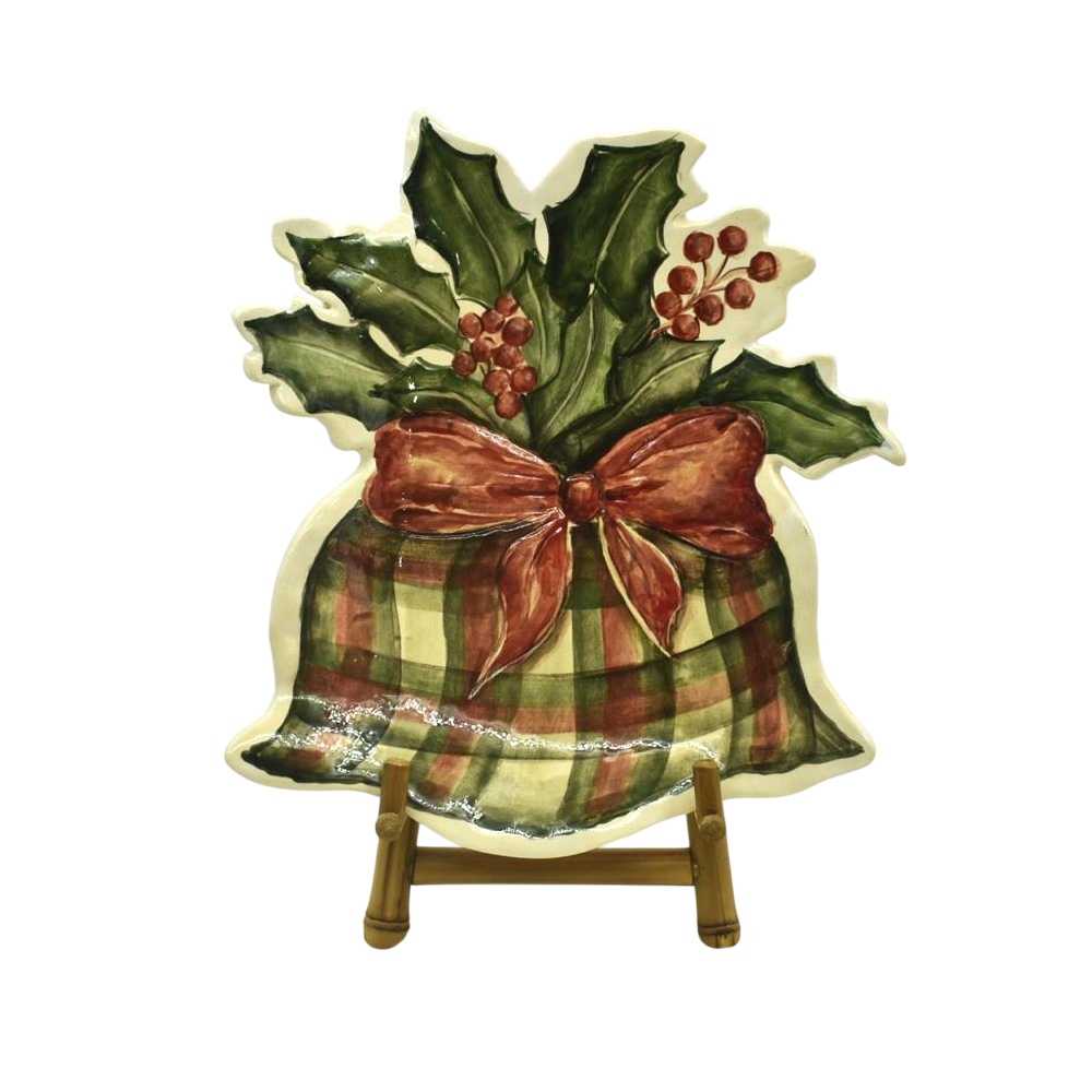 Uma graça de petisqueira de Natal com estampa xadrez verde e vermelho, azevinhos e laçarote