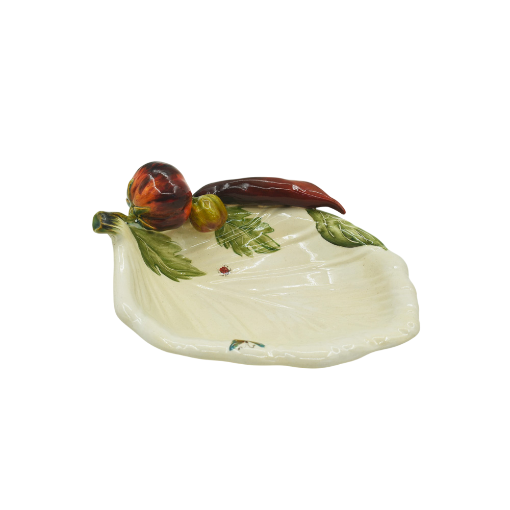Charmosa e delicada petisqueira em formato de folha com aplique de legumes