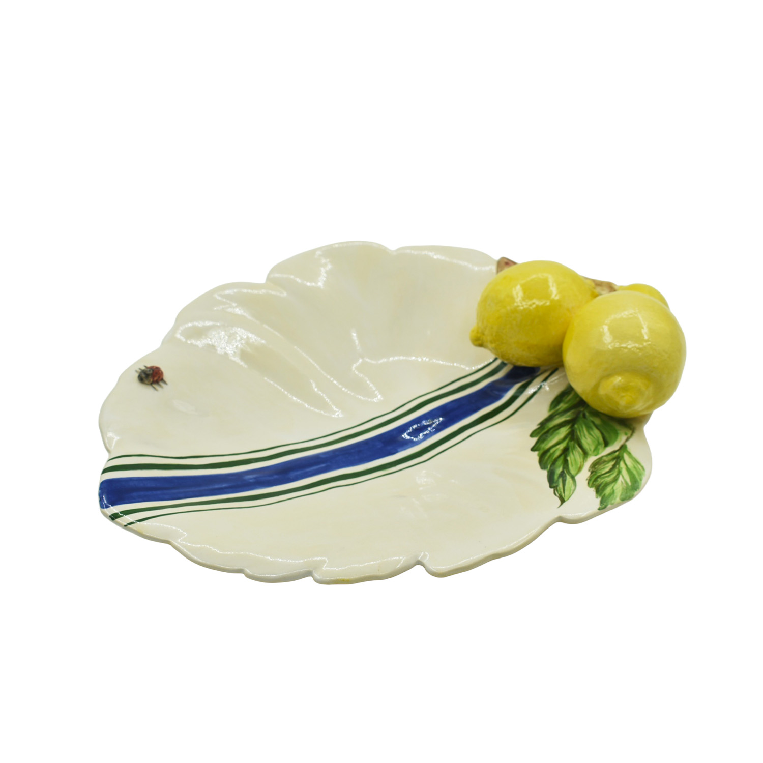 Charmosa petisqueira/ travessa em formato de folha, com listra azul e aplique de dois limões sicilianos