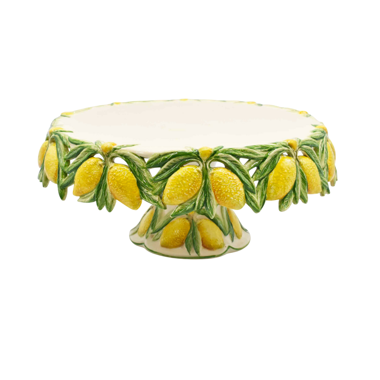 Linda boleira com pé e relevo de limões e folhas, para servir e enfeitar