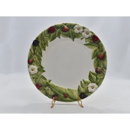 Lindo prato raso com borda em relevo de folhas, flores e morangos. Feito e pintado à mão