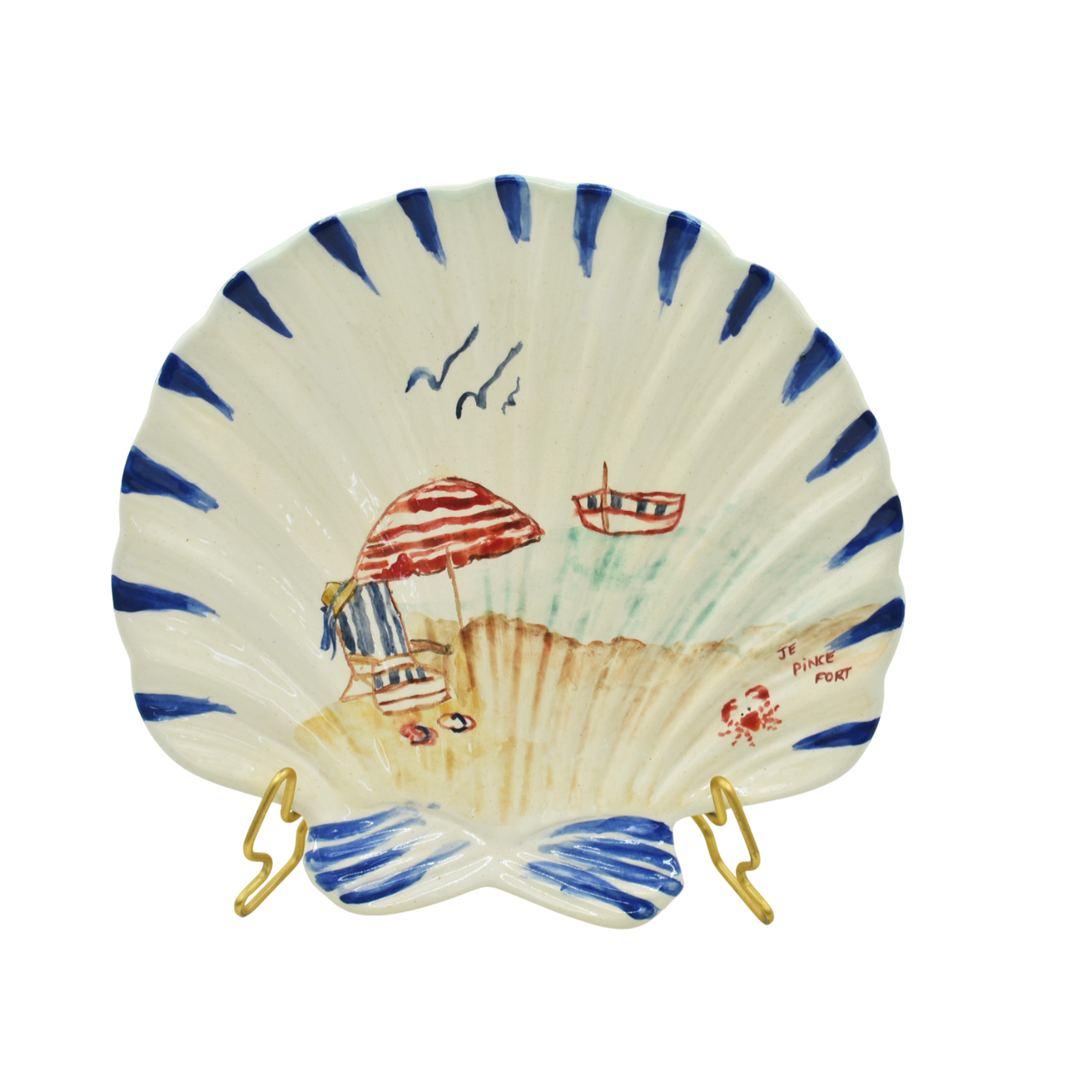 Divertido prato em formato de concha com pintura de guarda-sol e cadeira de praia