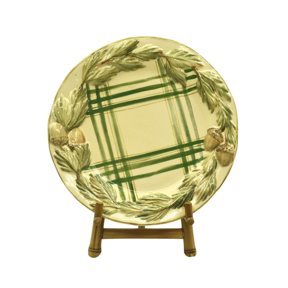Charmoso prato com estampa xadrez em verde e fundo amarelado e com relevo na borda de pinhas