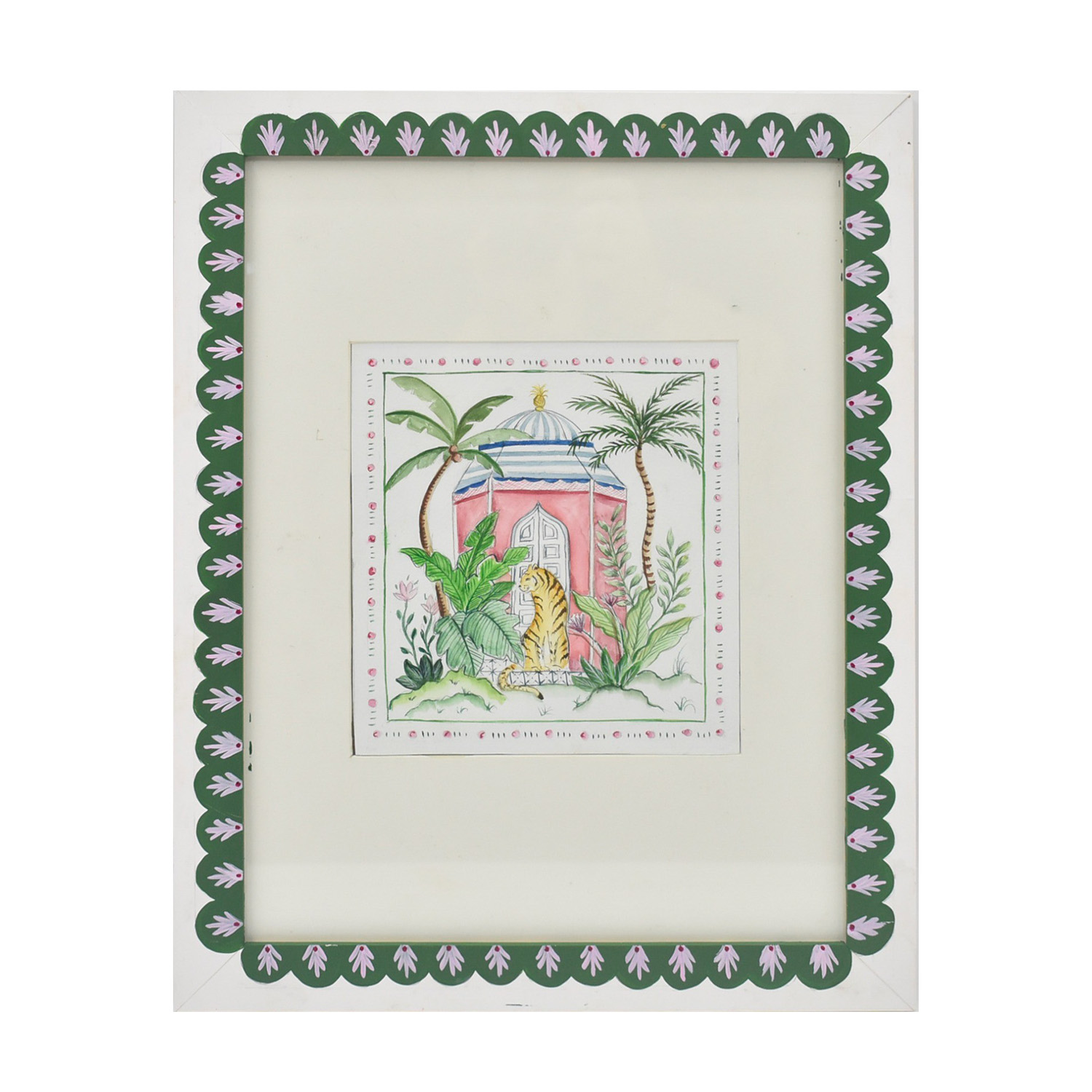Um charme para as paredes: quadro com moldura trabalhada e aquarela com tigre, coqueiro e palmeira