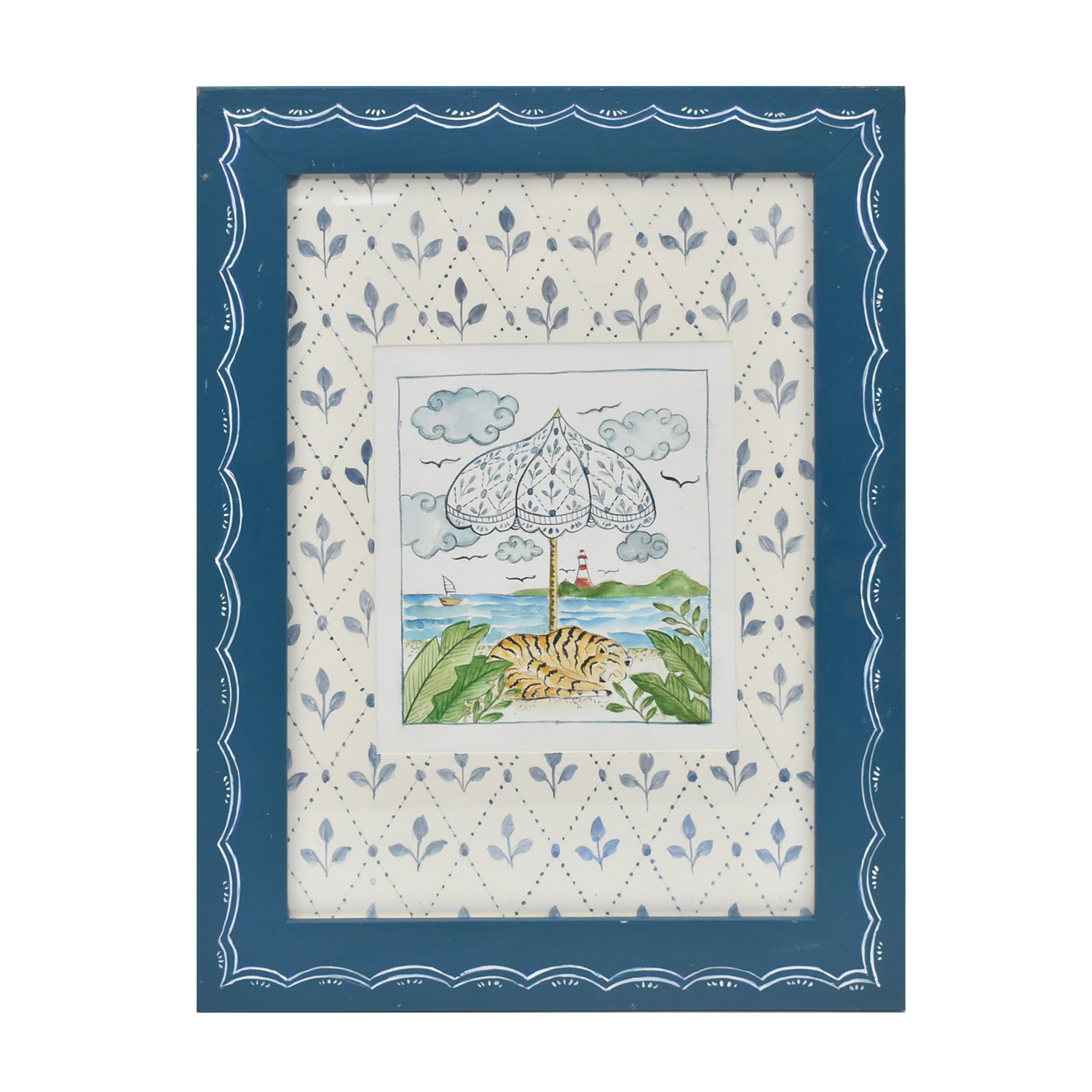Um charme para as paredes: quadro com moldura azul e aquarela com tigre e guarda-sol