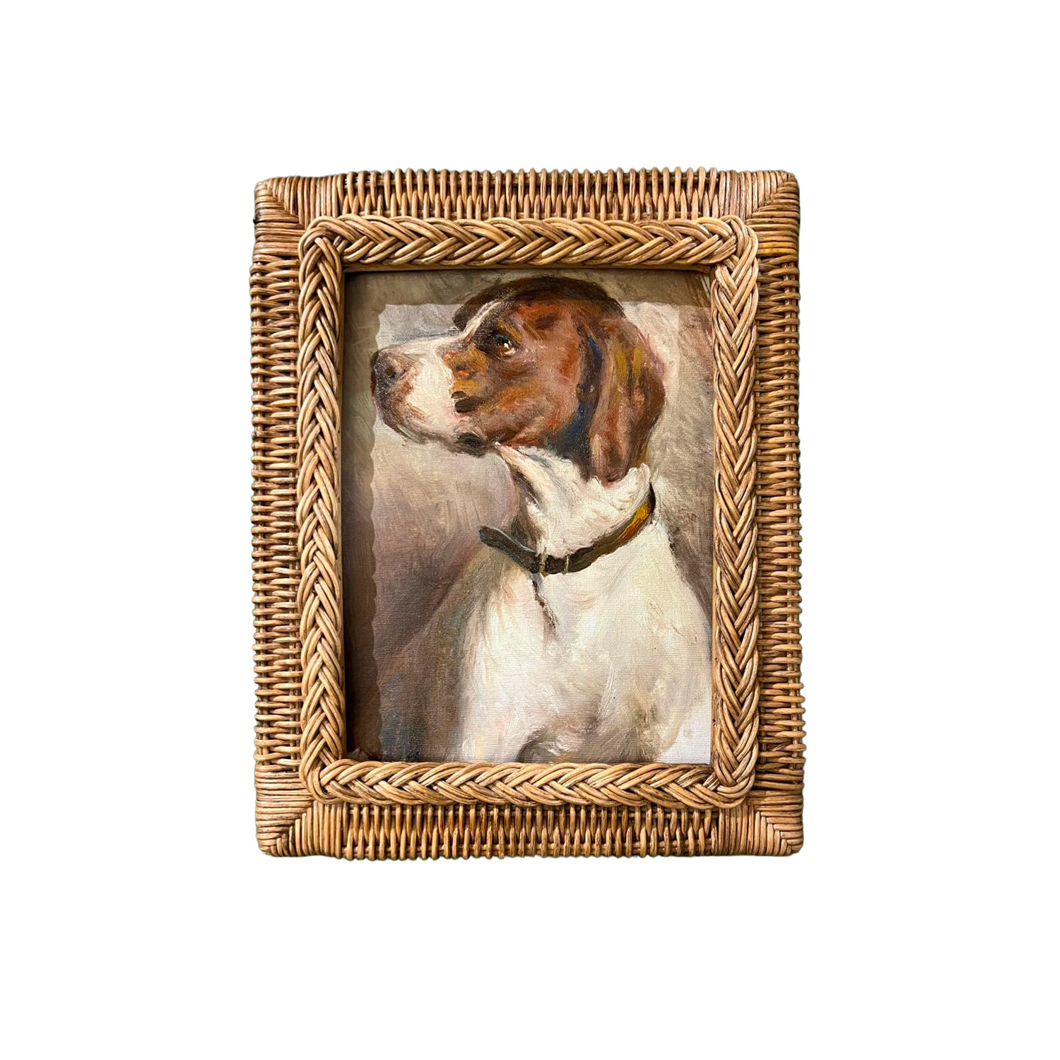 Um charme de quadro: pintura a óleo de cachorro em perfil com moldura de junco trançada