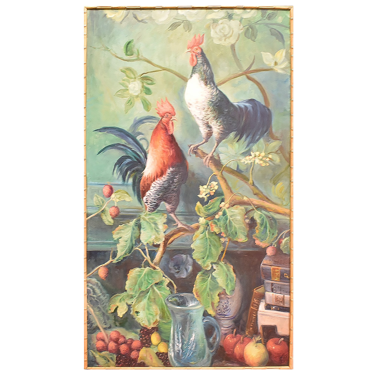 Linda pintura à óleo de galos nos galhos com frutas, moldura filete em bambu
