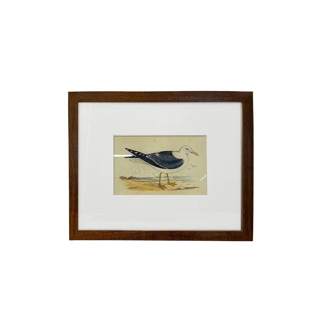 Delicado quadro com desenho de ave preta com peito branco e bico amarelo em moldura de madeira