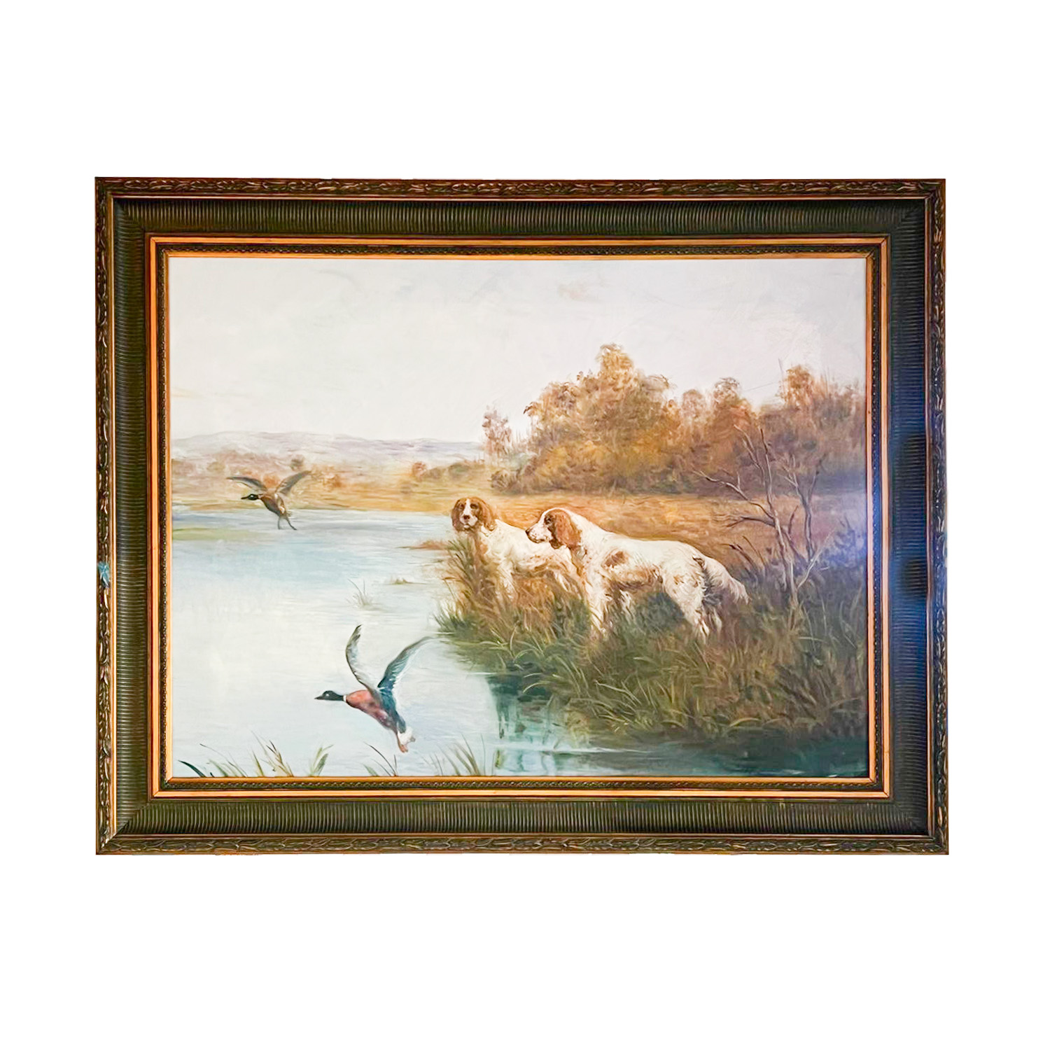 Um charme de quadro: pintura a óleo de dois cachorro com patos à beria do lago, com moldura trabalhada