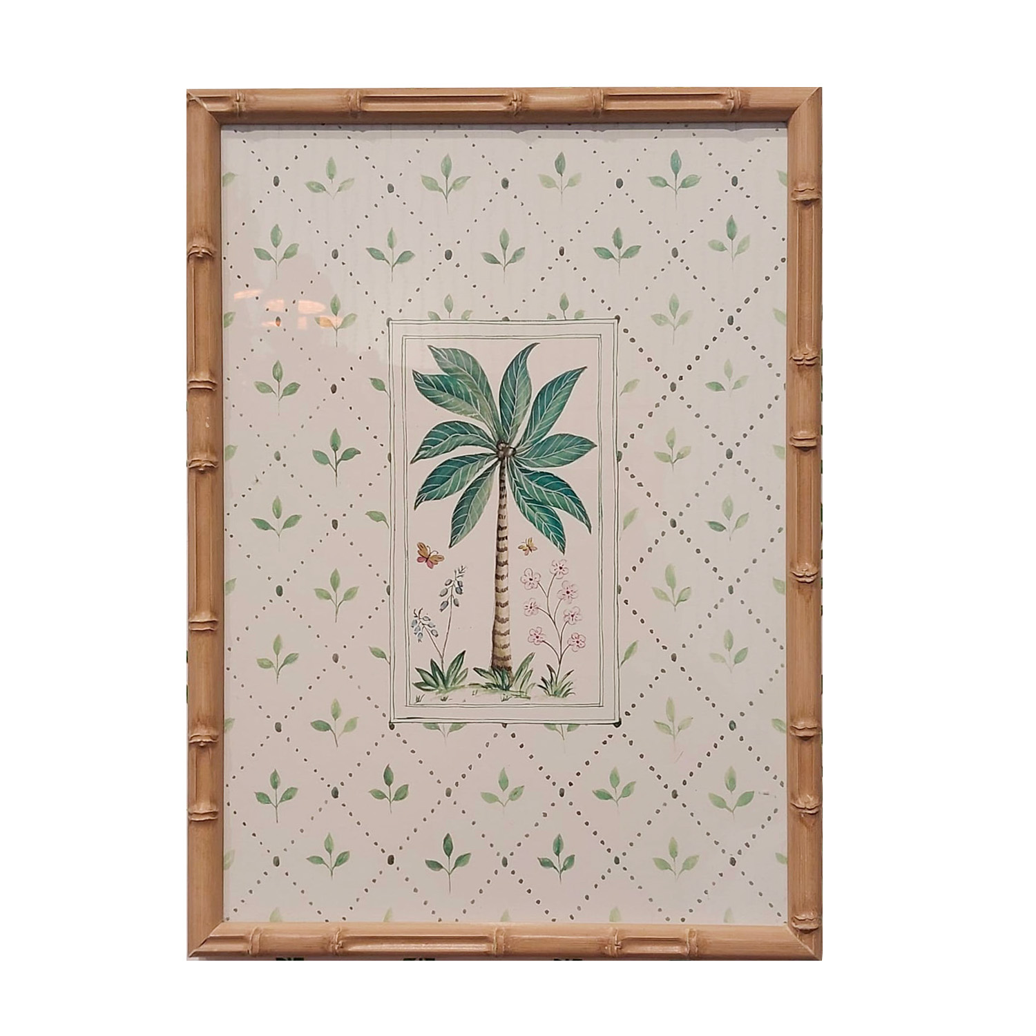 Um charme para as paredes: quadro com moldura em bambu com gravura de coqueiro