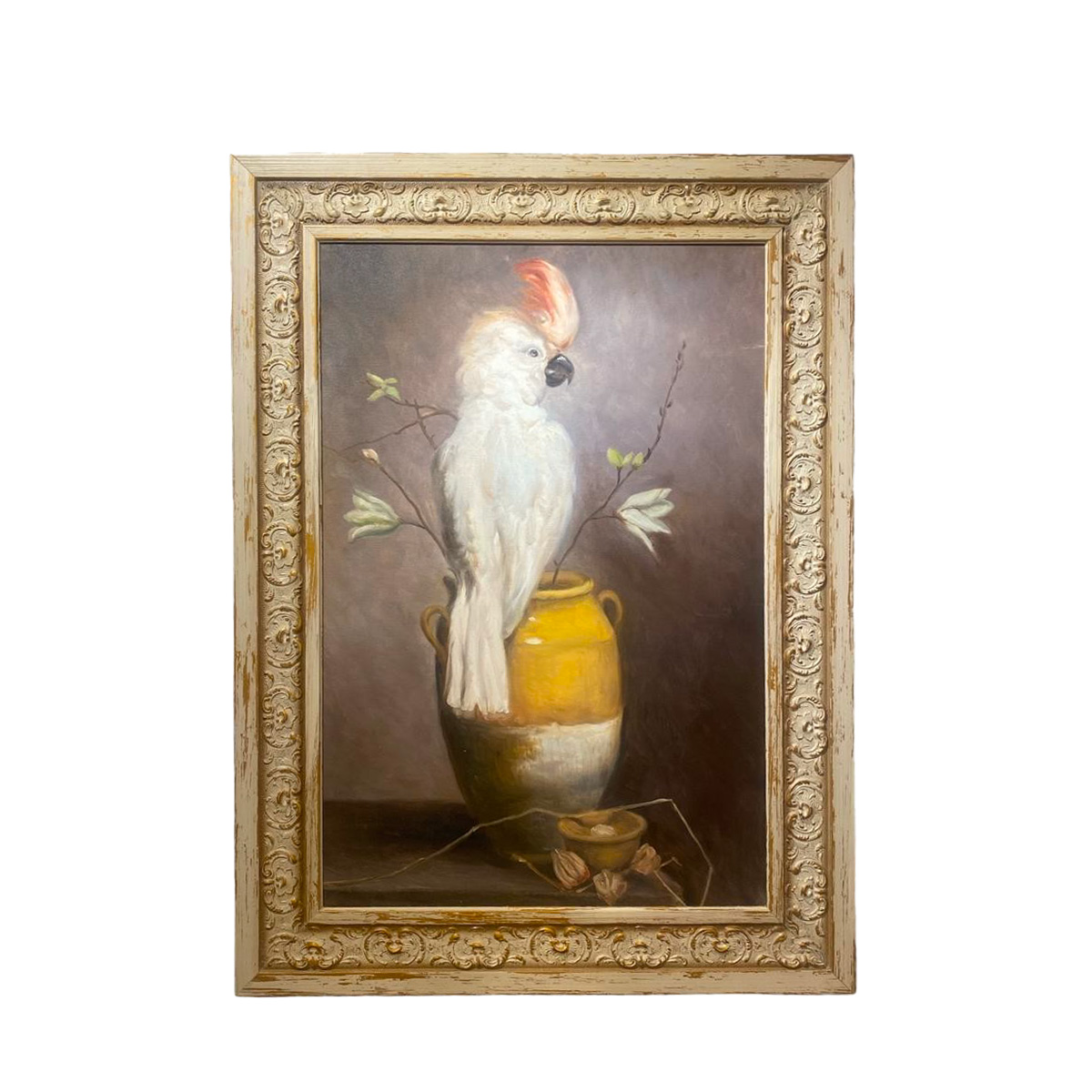 Lindo quadro com pintura à óleo de calopsita com vaso