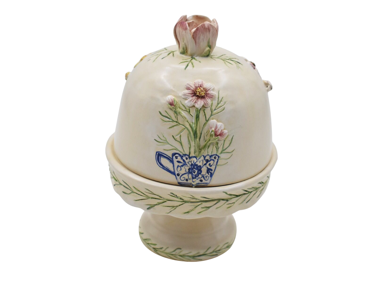 Charmosa queijeira com pé e com aplicação de flores cosmos